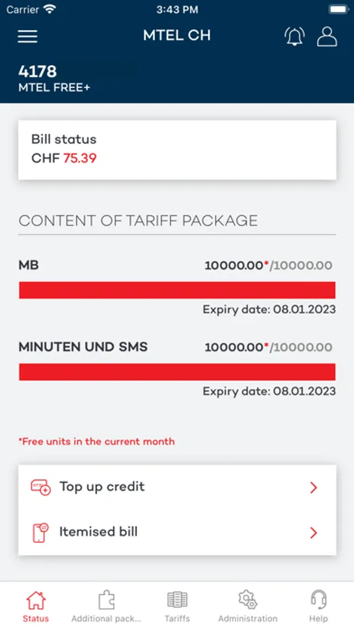 - Einsicht über die verbleibenden Freieinheiten (Minuten, SMS, Datenvolumen) im aktuellen Verrechnungszeitraum