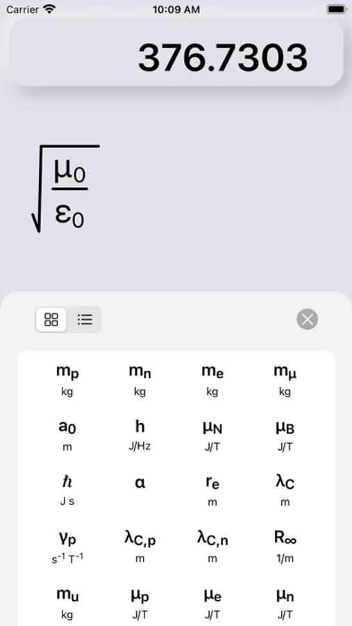 - Physics constants: you can access a catalog of 40 well organized constants to insert them in the calculation.