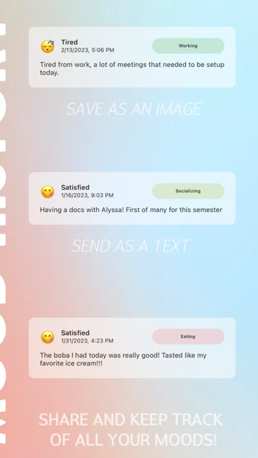 To make tracking your moods even more engaging, we've implemented a fun achievements system that celebrates your progress and motivates you to continue on your journey. As you log more moods, you can unlock new achievements ranging from simple milestones like logging 7 moods, to more challenging ones like logging 500 moods!