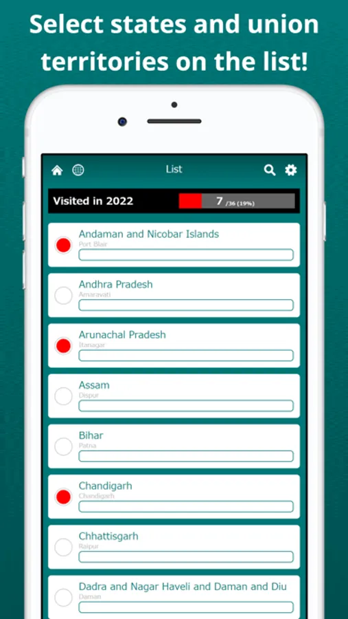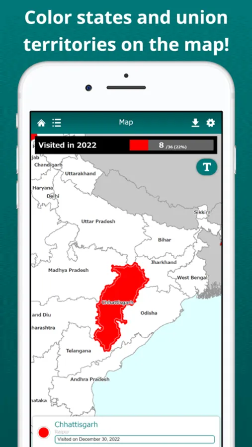Visualize the states and union territories you have visited on the India map. Tapping a state or union territory on the map, you can edit its color and note. By displaying the labels, you can easily locate states and union territories on the map. The map can be zoomed in and out.