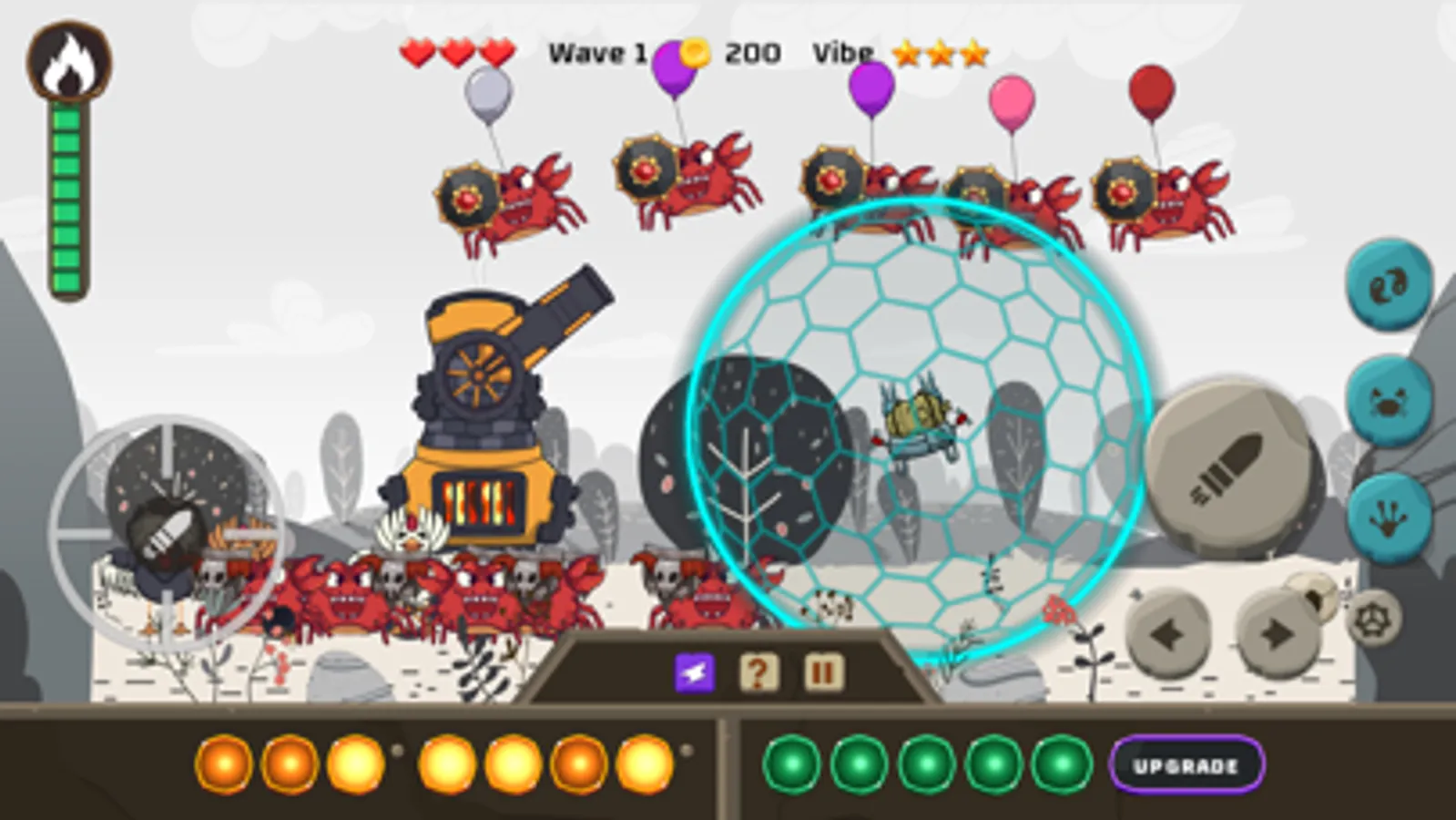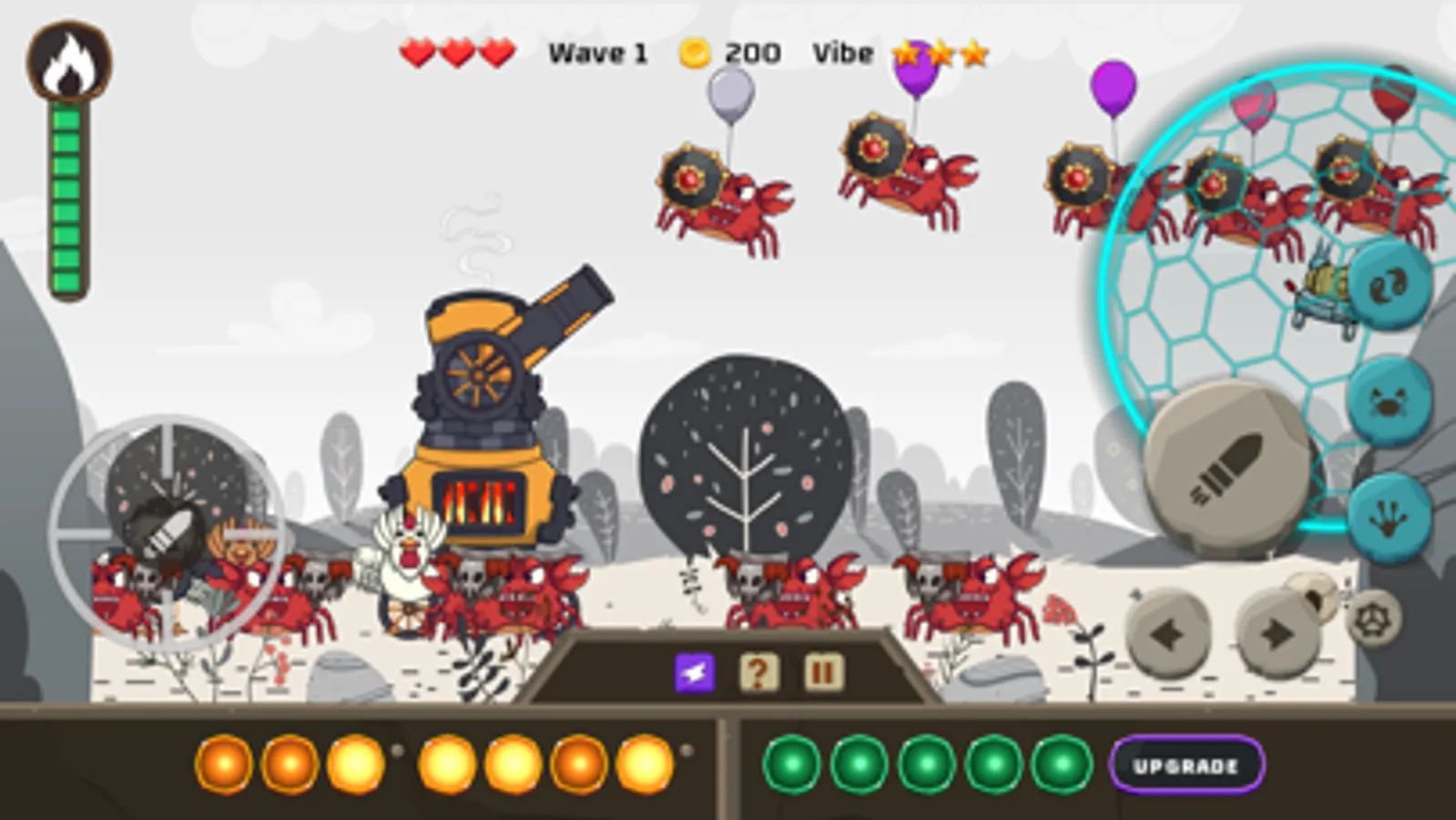 Waves of hungry villain crabs have the only goal to steal your party chickens. Defend your tribe with an archaic cannon and abundance of explosives. Crab Invasion is a fast paced tower defense game with a revolutionary and never-seen-before gameplay. Shoot, place and upgrade towers, but also play music as a DJ to your allied troops. Eliminate all invaders in fifteen handcrafted waves. Unlock more levels and discover new enemies and strategies. Get ready to shoot and blast invading crabs. Become part of this addictive Tower Defense game.