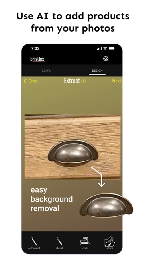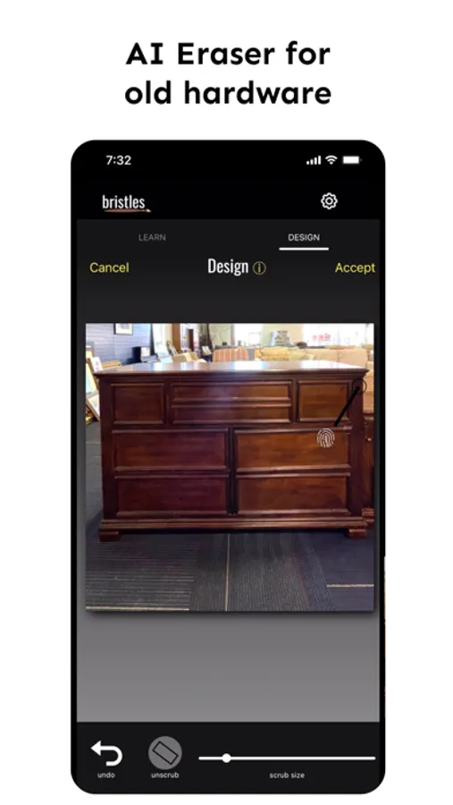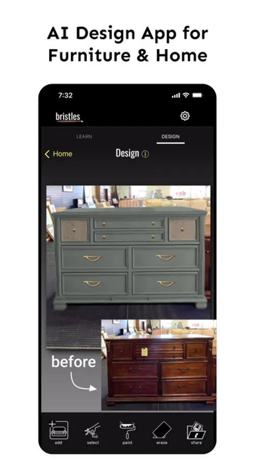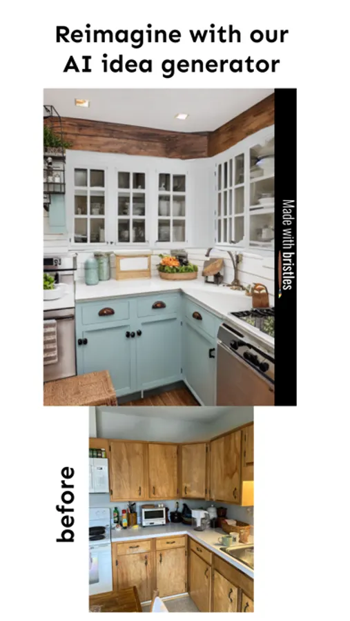 Bristles AI helps DIYers and Upcyclers visualize their creative ideas for transforming furniture, interior spaces, and exterior spaces with new paint and materials. Our AI idea generator creates inspiration from your images of your pieces or spaces. Our AI eraser helps you remove hardware or clutter so you can paint and design on a "blank canvas". Design with painter’s tape and choose any paint color from a photo or screenshot. Add new hardware or décor from your own photos with AI background removal or choose options from our library of products.