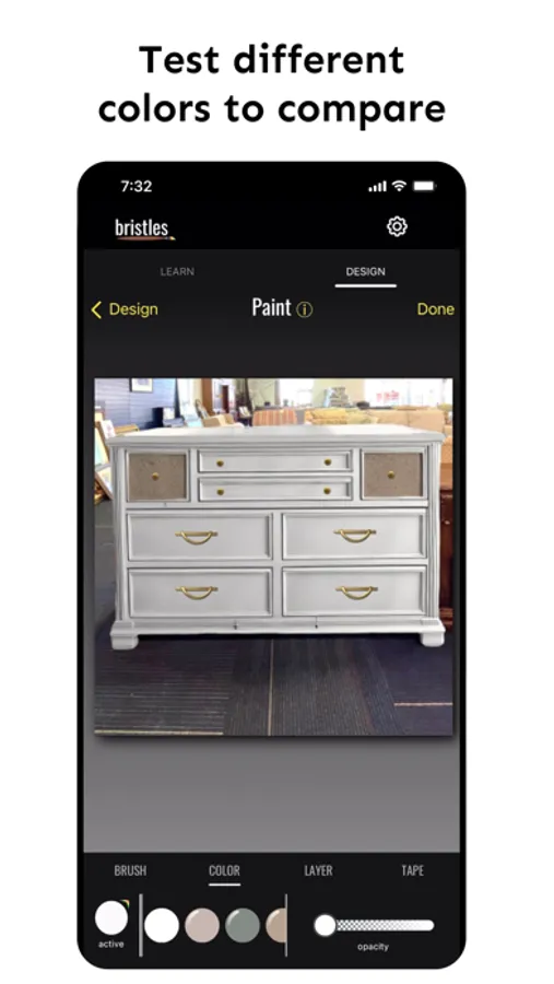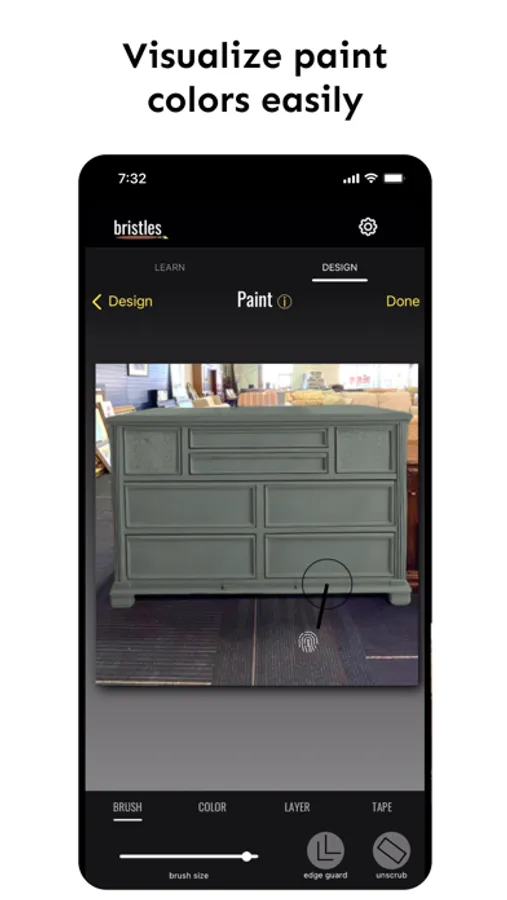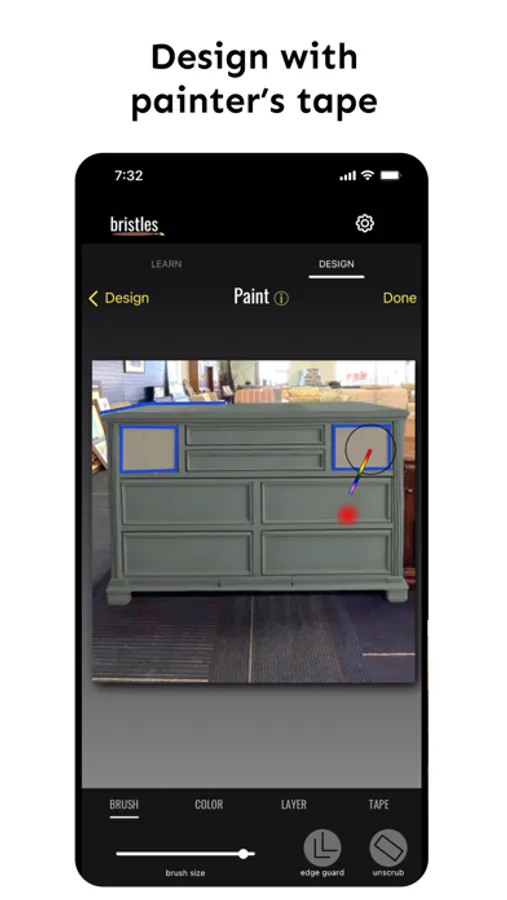 Unlike other painting apps, you have ultimate creative flexibility with Bristles. Our AI edge guard and virtual painter's tape helps you keep your paint lines nice and crisp while empowering you to design freely. Paint in as many colors as you want and paint anything from walls, to ceilings, to furniture - you can even paint the dainty details like hardware!