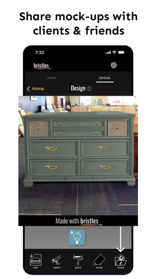All you need are images to build realistic mock-ups of your project ideas. If you're a visual person, you'll love the Bristles app and you'll finally have a tool to help you show your creative ideas to your spouse, clients and friends. Join the furniture artists and DIYers testing and sharing design ideas with Bristles BEFORE putting paintbrush to project IRL!
