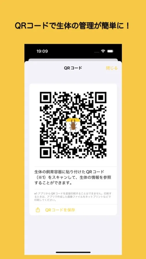 プリンタなどで印刷したQRコードを飼育ケースに貼り、端末のカメラで読み込むことで、産卵セットや生体の情報を確認することができます。