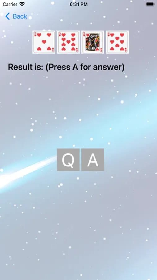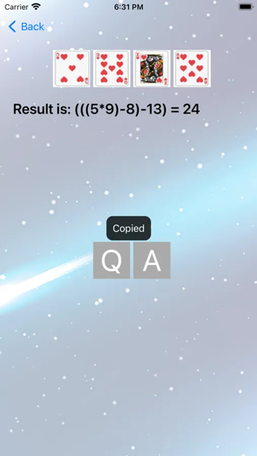 (1) Play mode: clicking 'Q' will randomly show 4 cards/numbers, so that you and your friend can go play the Math24, and clicking 'A' will show you the answer.