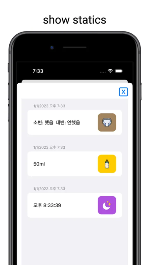 아기의 일상을 기록할 수 있는 앱 입니다.