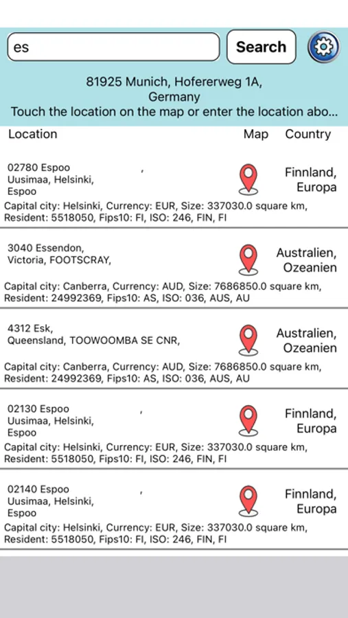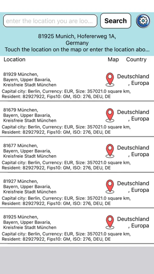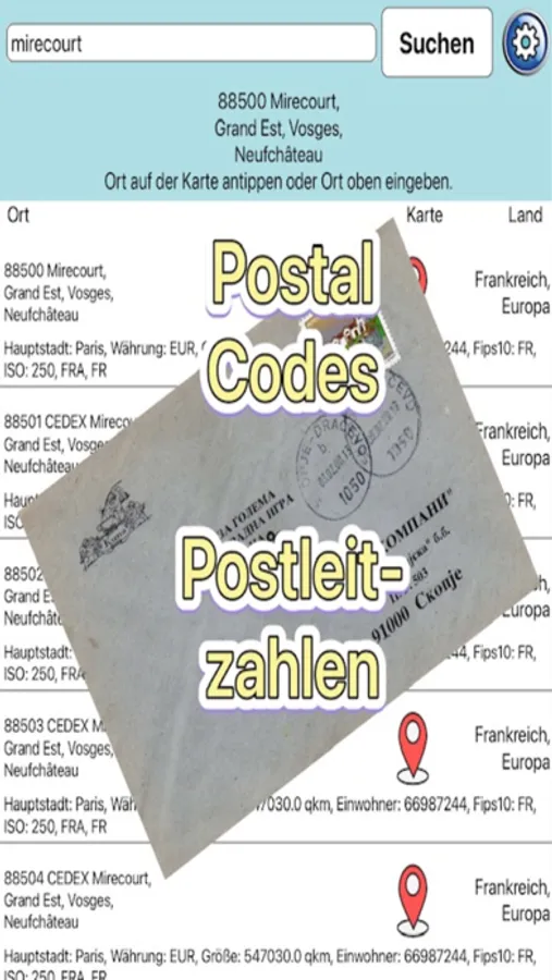 Find every place easily and clearly in a list with a search function or directly on the map. You can find the corresponding postal code for each place, places with several postal codes offer a simple selection of all possibilities. Each location is shown on the map with a zip code and other information about the country.