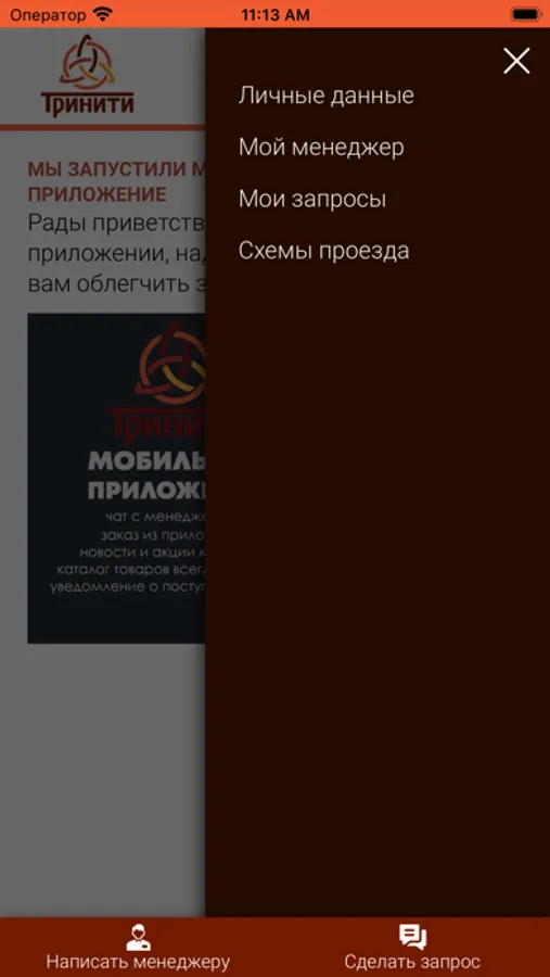 Приложение для постоянных клиентов компании Тринити. Приложение позволяет делать повторные заказы , быть на связи с менеджером.