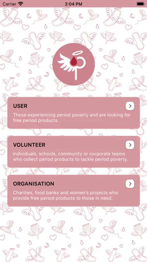 Period Angels is a one-stop platform for tackling period poverty. It directs USERS (those experiencing period poverty) to free period products in their local area; enables VOLUNTEERS (e.g. schools) who collect period products and connects them to local ORGANISATIONS (e.g. food banks) who require free products for those in need.