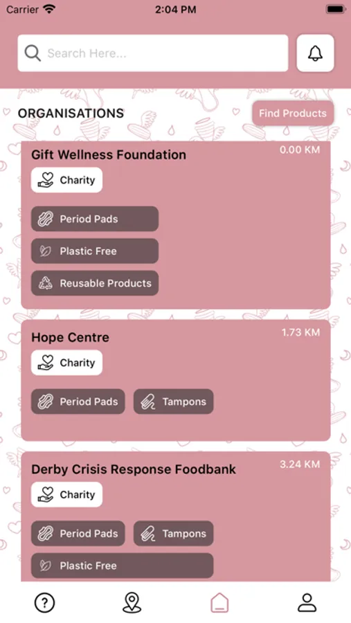 USERS (THOSE EXPERIENCING PERIOD POVERTY) can log in to the app and be directed to the nearest location where free period products are available based upon either the user's GPS location or postcode. Users can filter their search on the type of products available and find where exactly the products are located.