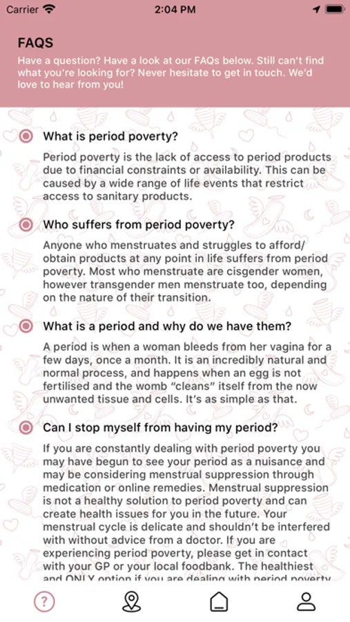 The Period Angels app also provides menstrual health education in the special Planet Period FAQ’s section, from our founding partner Gift Wellness, who provide natural period products and have been tackling period poverty since 2012.