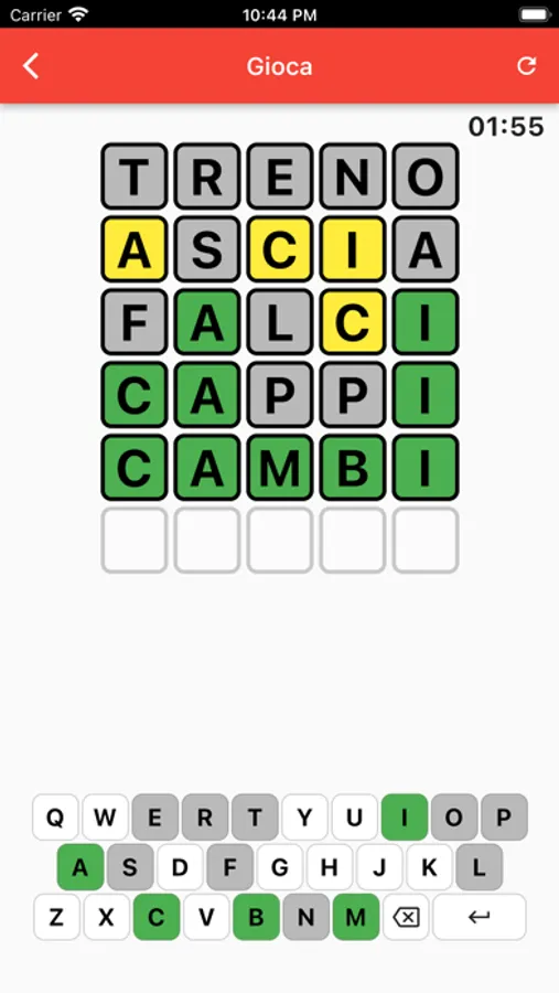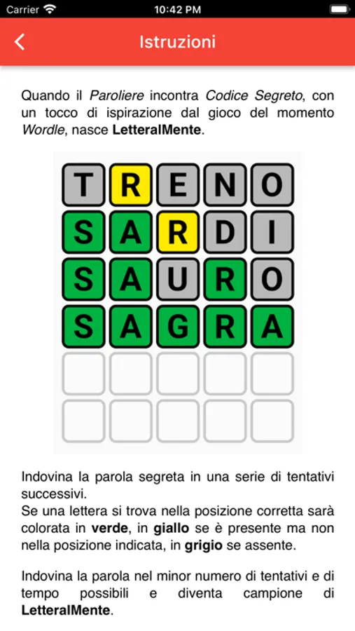 Se una lettera si trova nella posizione corretta sarà colorata in verde, in giallo se è presente ma non nella posizione indicata, in grigio se assente.