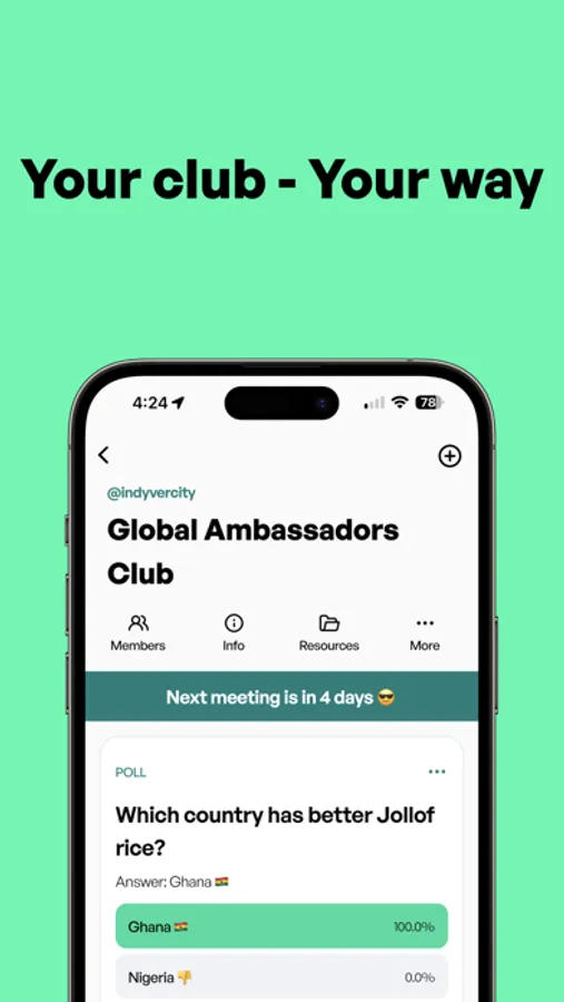 - Feed: All of your announcements, resources, and polls are compiled into a scrollable feed. Your members can view this feed to stay up-to-date on everything that's happening in your club.