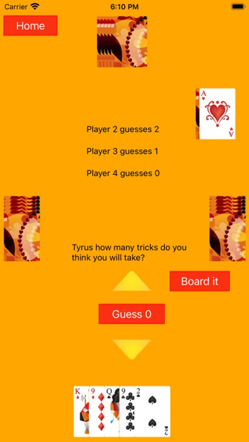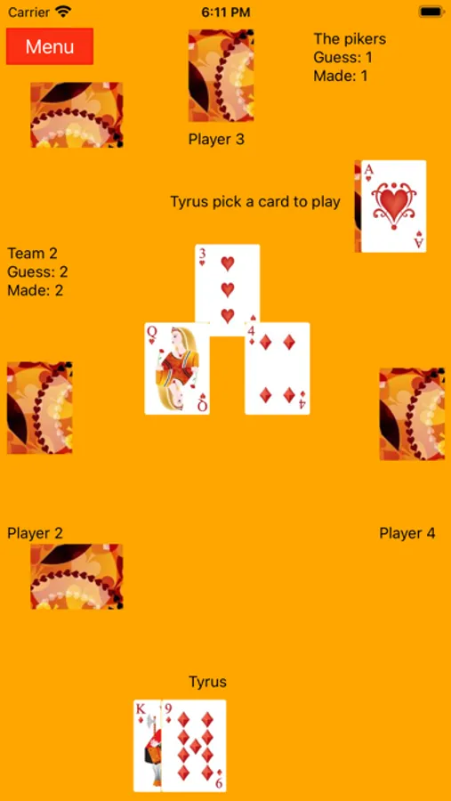 The game is similar to bridge and spades. The goal of the game is to win tricks, by which you score points. The idea is to guess the number of tricks you think you'll make, the more accurate you are without guessing too much, the more points you make. The game starts with one card in doubles play and two cards in singles play, progressively going up one card each round up to 13 cards - then from 13 back down to the number of cards the game started with. The idea is to get the most points by the end of the game. For more detailed rules, download the app or visit my website at the support url.
