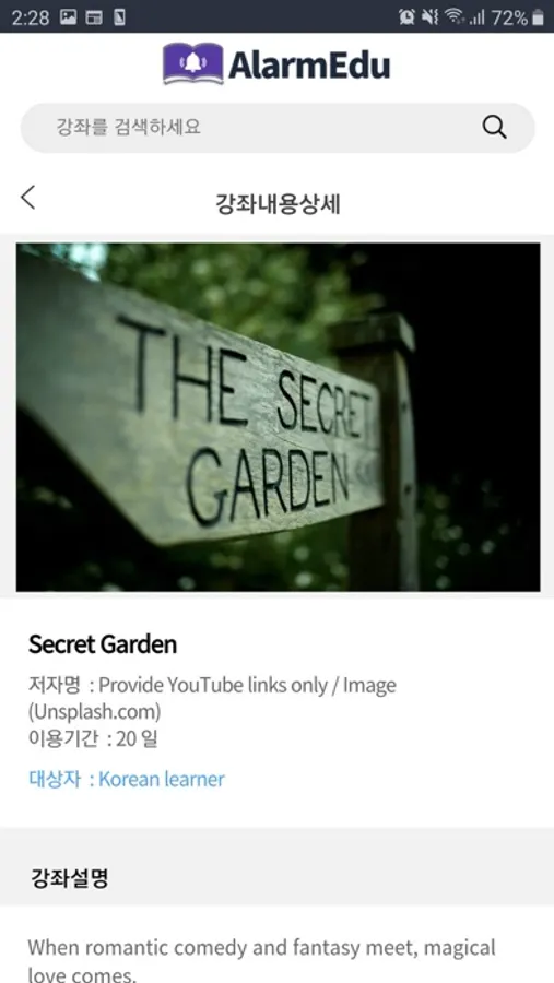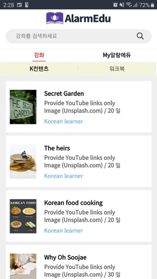 Set an alarm consisting of a segmented K-drama or movie (text + YouTube video) that changes every time, and foreigners can practice Korean repeatedly around the learning topic provided by the alarm. The Korean language that the learner followed was recorded and stored as a voice so that repeated learning was possible. In addition, learning is promoted by forming a social network around the learning topic set by the alarm and providing compensation (gift) according to the completion of the learning task.