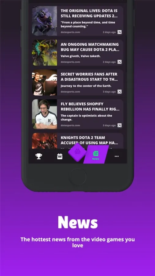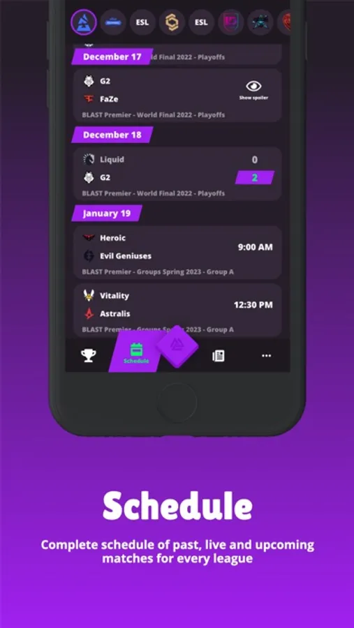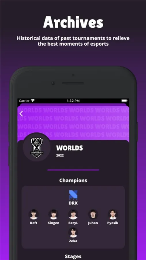 • A complete schedule of past and upcoming matches. Previously recorded stats of past tournaments to relive the best moments of esports.