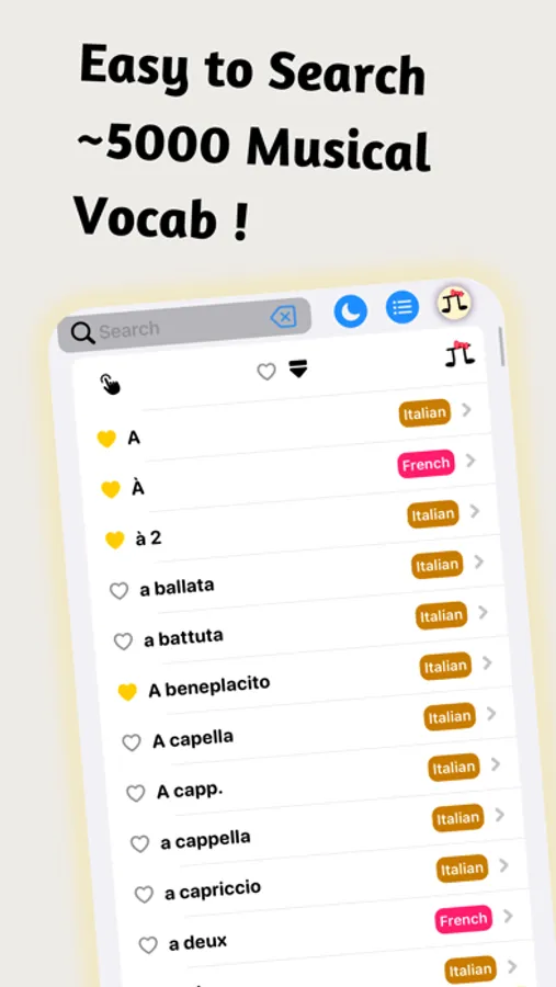 You can easily search around 5000 Musical Terms in different language and check the meaning.