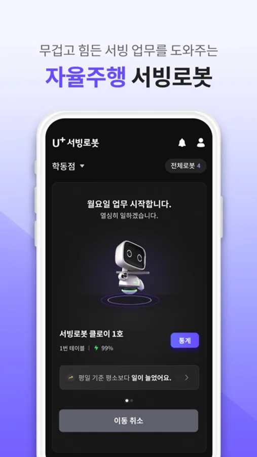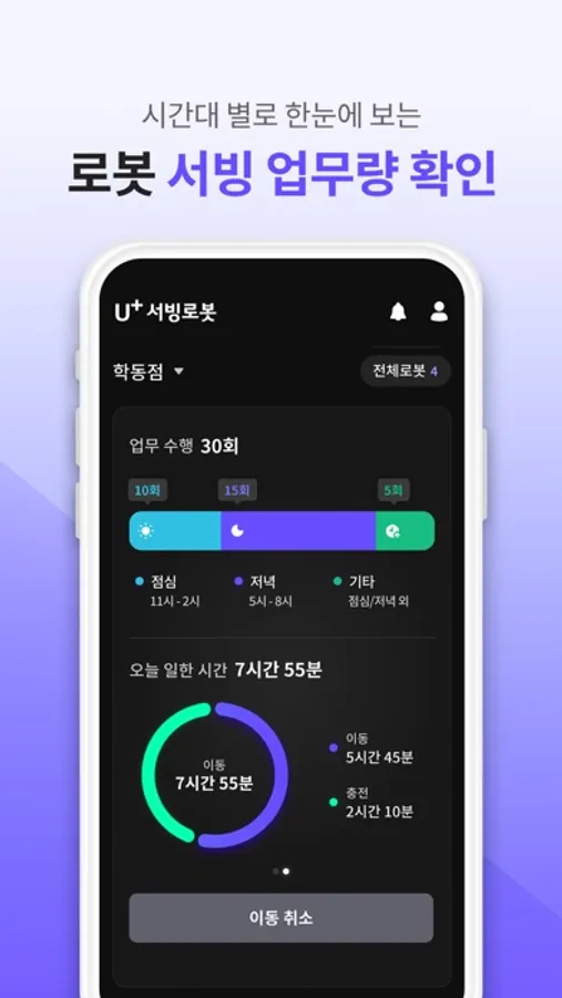 - 매장에서 로봇이 오늘 얼마나 열심히 서빙 업무를 수행했는지 확인할 수 있습니다.