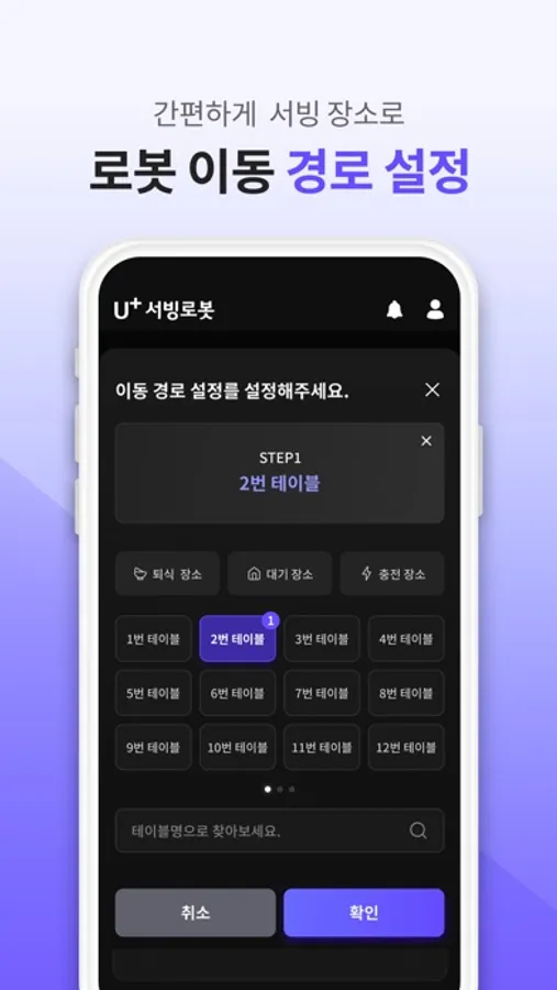 - 서빙할 테이블과 대기장소, 퇴식장소, 충전장소로 로봇을 원격으로 이동/중지시킬 수 있습니다.