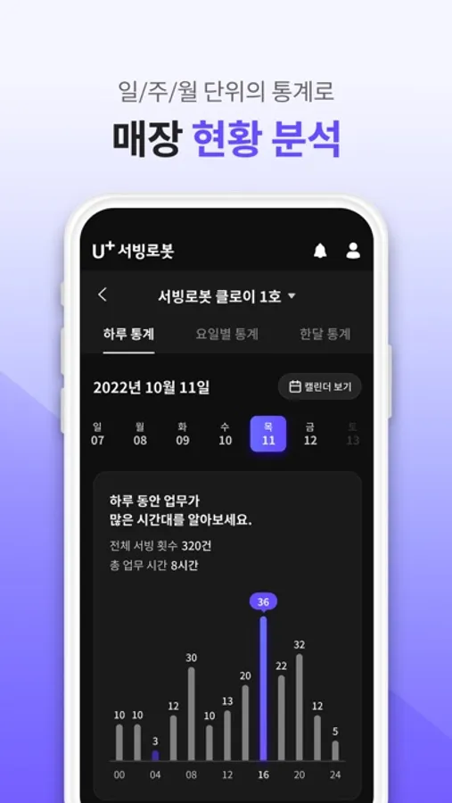 - 로봇의 서빙 업무량을 일별, 주별, 월별로 확인할 수 있습니다.