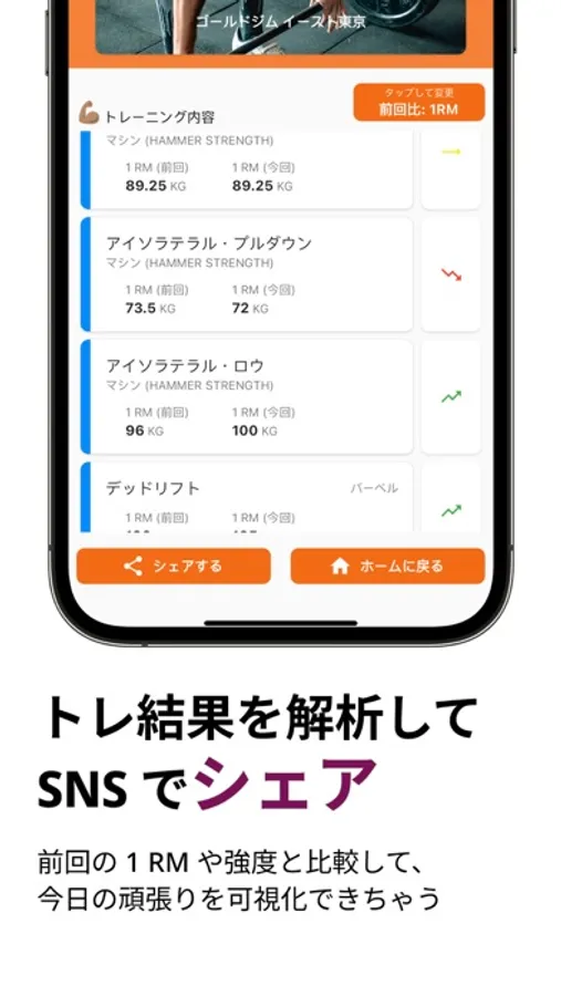 ・ グラフから重量 (1 RM・強度) やトレーニング時間の推移を確認