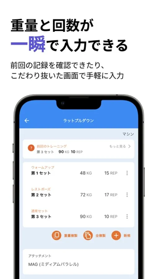 ・ トレーニング内容 (重量・回数・セット数・時間・場所) を記録
