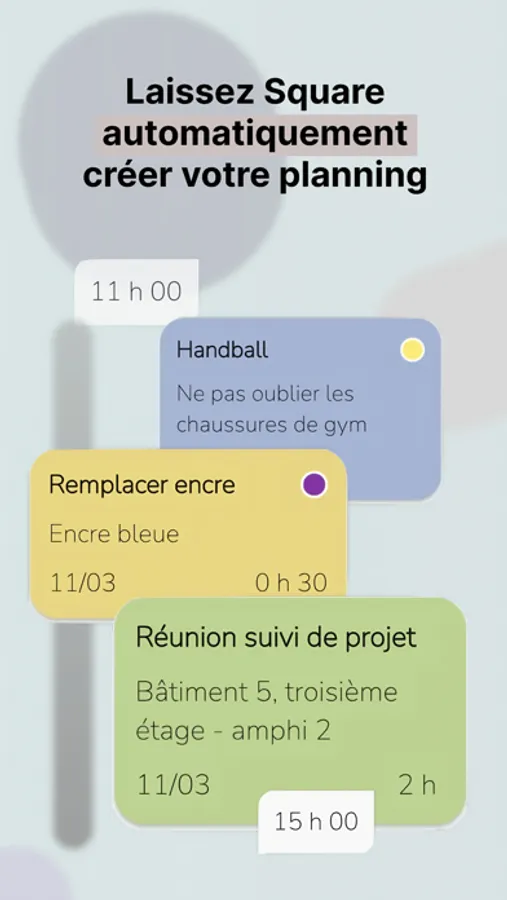 Grace à son design épuré et intuitif, Square est simple à utiliser. Vos tâches sont visibles et facilement identifiables, et toutes les autres fonctionnalités sont accessibles en un clic. Vous comprendrez dès la première utilisation comment l'application fonctionne !
