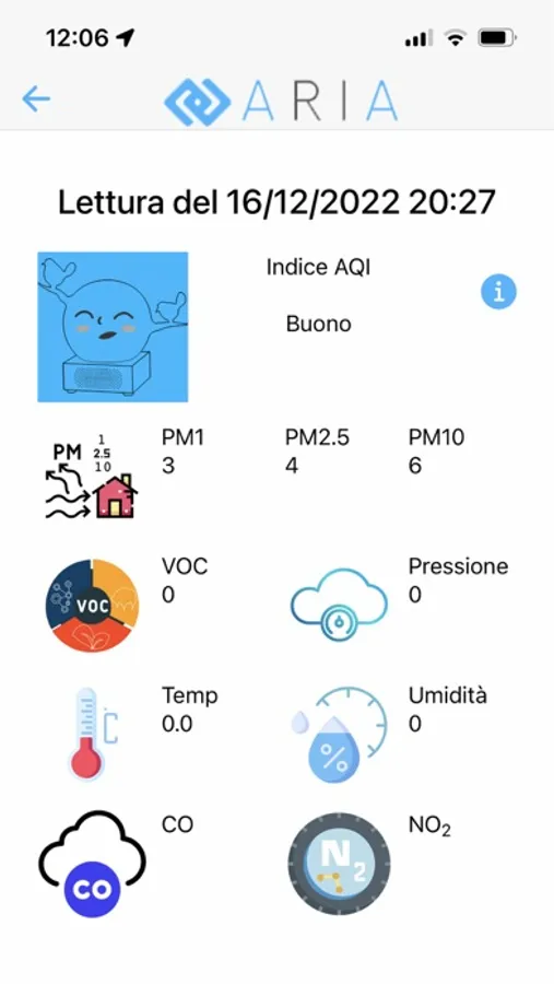 ARIA è l’ App per conoscere il valore dei componenti dell’aria che respiri, in questo momento e luogo, attraverso il dispositivo abbinato. L’algoritmo di misurazione segue la scala AQI internazionalmente riconosciuta e ricalcola i valori ogni minuto. Un archivio interno memorizza le misurazioni precedenti. Misura PM2,5, PM10, CO, NO2, H2F, VOC