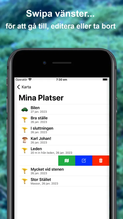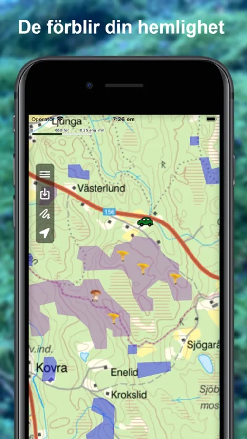 Du kan markera var du hittar svamp, dessa ställen förblir din hemlighet och sparas bara på din telefon. I appen kan du enkelt hantera dina svampställen, gå till ett gammalt favoritställe, editera eller ta bort ett svampställe. Du kan även markera var du parkerat bilen.