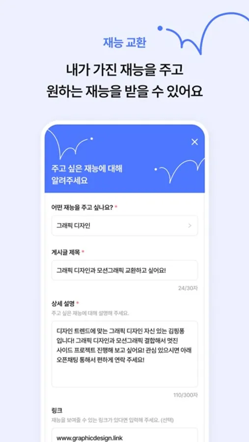 - 내 재능을 나눌 수 있습니다. 내 재능을 얻고 싶은 다른 유저가 내 글을 보고 달려 있는 오픈채팅 링크로 연락할 수 있습니다.