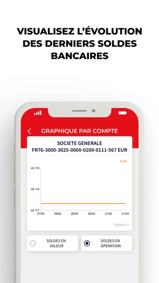 • Des graphiques d’évolution des derniers soldes bancaires (6 jours, 6 semaines, 3 mois)