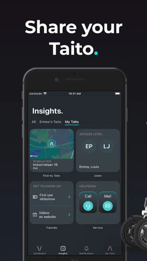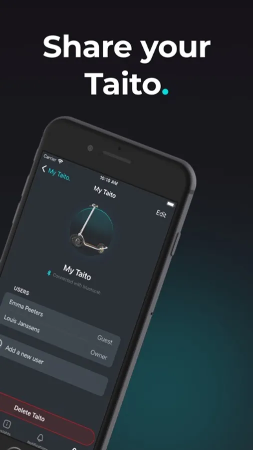 Unlock your Taito’s full potential with the app. Mount your phone on the handlebars and access a mountain of data along the way. Lock and unlock your ride, visualise your battery levels, share it with friends, never forget where you parked - all with just a few taps and swipes. Be sure to keep your app up-to-date to enjoy all the latest and greatest features.