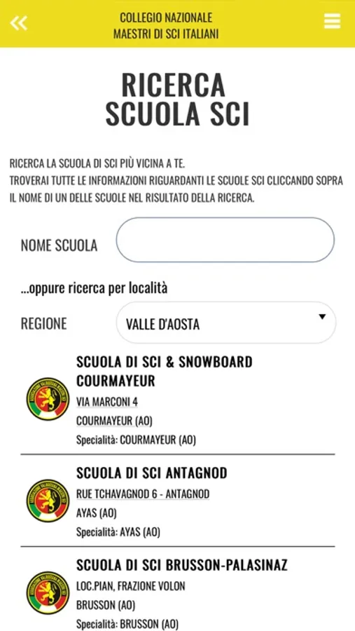 Anche l'utente generico può utilizzare questa App per trovare la scuola sci più vicina a lui, verificare se il Maestro di Sci con il quale sta facendo lezione è abilitato o meno a tale servizio.