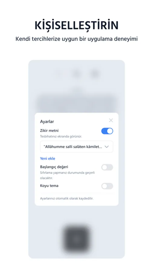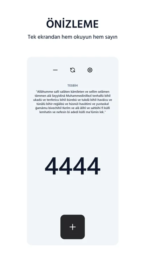 Önizleme seçeneği ile tesbihatlarınızı ekranda görüntüleyebileceğiniz, kişisel tercihlerinize göre kendinize uyarlayabileceğiniz seçeneklerin mevcut olduğu bir zikirmatik uygulaması.