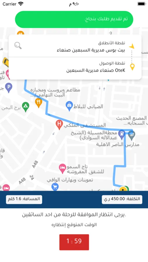 عند بدء الرحلة سيتم ايصالك اشعار بان رحلتك قد بدأت وعند وصولك الى نقطة الوصول تستطيع تقييم السائق وكتابة اذا كانت هناك اي ملاحظة على الرحلة او على السائق.