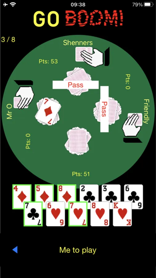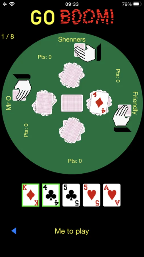 Play continues until a player wins the hand by playing their last card (BOOM!) and the winner is awarded points according to the cards remanning in the other players hands - picture cards are worth ten and all other cards are face value. Matches can consist of 8, 16 or 32 hands.