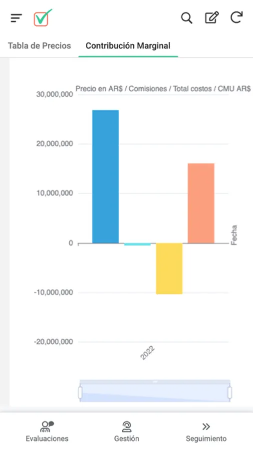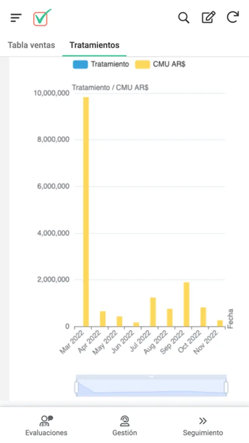 2. La vista Ventas donde puede agregar datos de los pacientes atendidos, el monto de pago por servicio y los costos. La aplicación calculará automáticamente la contribución marginal o ganancia bruta por tratamiento.