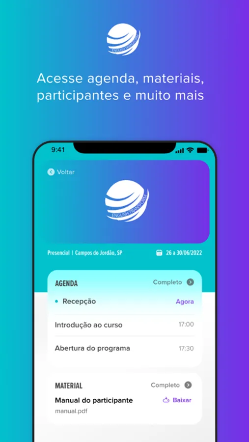 Através do nosso novo APP, é possível ter acesso a informações a respeito dos programas e cursos da English Transform na palma da mão. Os alunos poderão, através de seu acesso, conferir a agenda de palestras, workshops e experiências práticas; obter os materiais disponibilizados pelos facilitadores dos momentos; conectar-se com os demais participantes e fazer valer a experiência de aprendizagem.