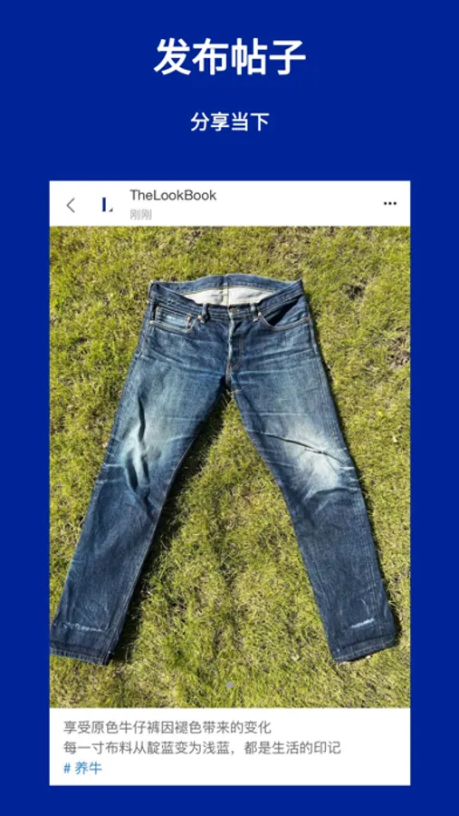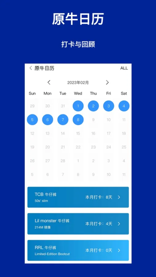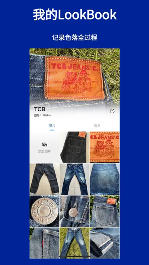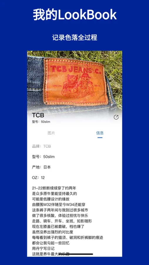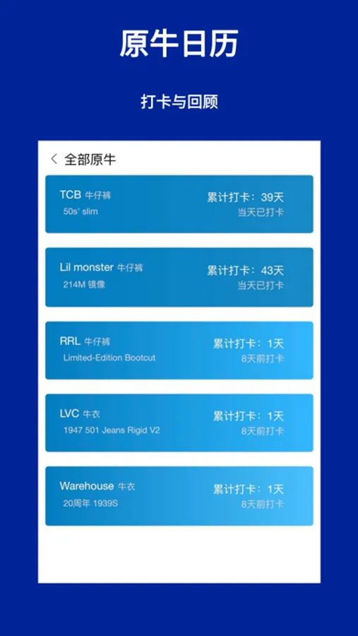 早期原牛爱好者习惯在内袋写下时间记录自己脱浆、洗牛过程,随着移动时代的到来,不少牛友在使用日历类或打卡类APP,TheLookBook精心设计了原牛日历功能,方便爱好者们进行裤子的时间记录和清洗记录,后续更新更会具备展示功能。