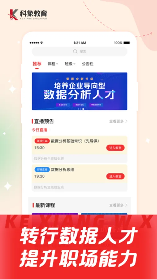 “科象网校”是面向学习数据分析的用户提供的一款移动智能学习平台,数据分析是对原始数据进行收集、加工和整理,使得数据获得更加可视化的呈现,提供相应的价值和结果。