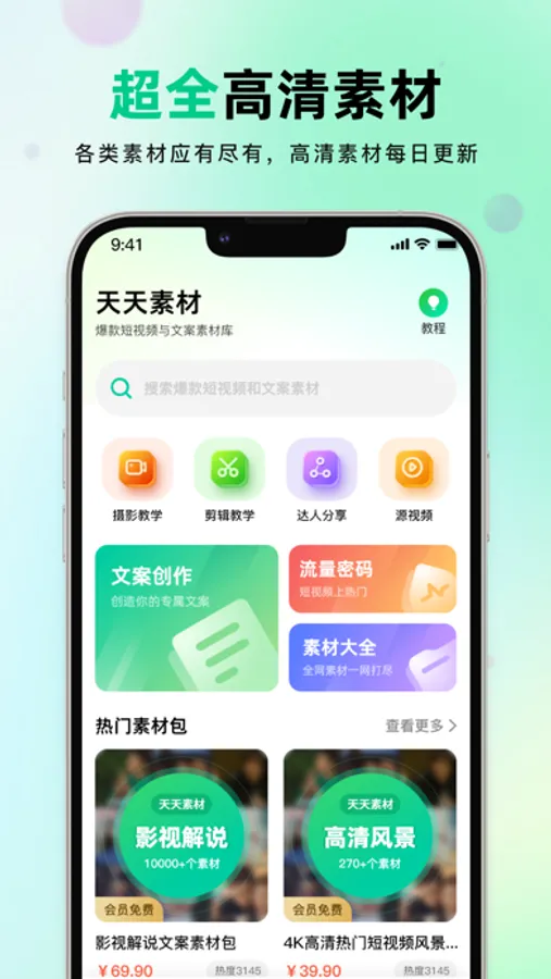 天天素材提供制作视频、发动态等各种风格的素材。视频素材、图片素材、文案素材一键获取,下载到手机本地。