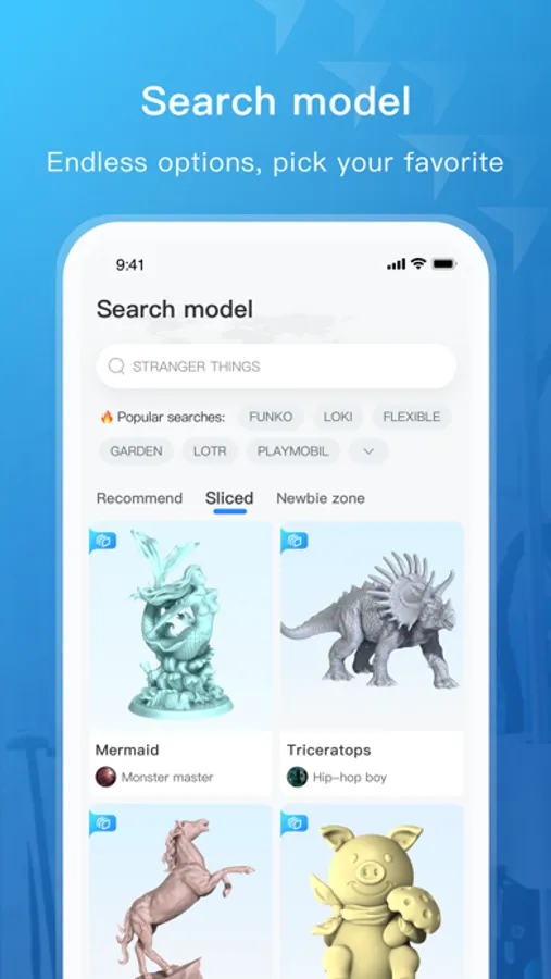 Our app offers a vast selection of model resources that can be easily found through simple searches. In the Sliced model area, we also provide sliced files that have been tested for printing to help you achieve high-quality prints with ease.