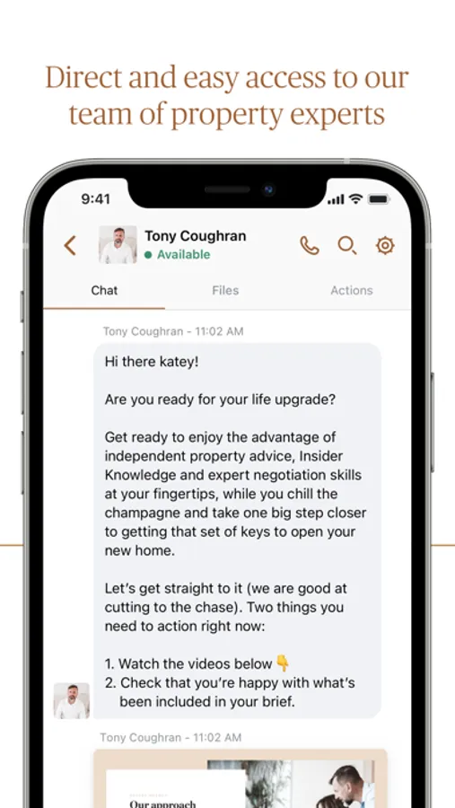 Our mission is to make the buying process as simple as possible. With full end-to-end data encryption to protect your privacy, you can log in at any time to review your details, track the progress of your next move, and access a range of working documents — from shortlists to final contracts — along with interactive videos and inspections we capture along the way.