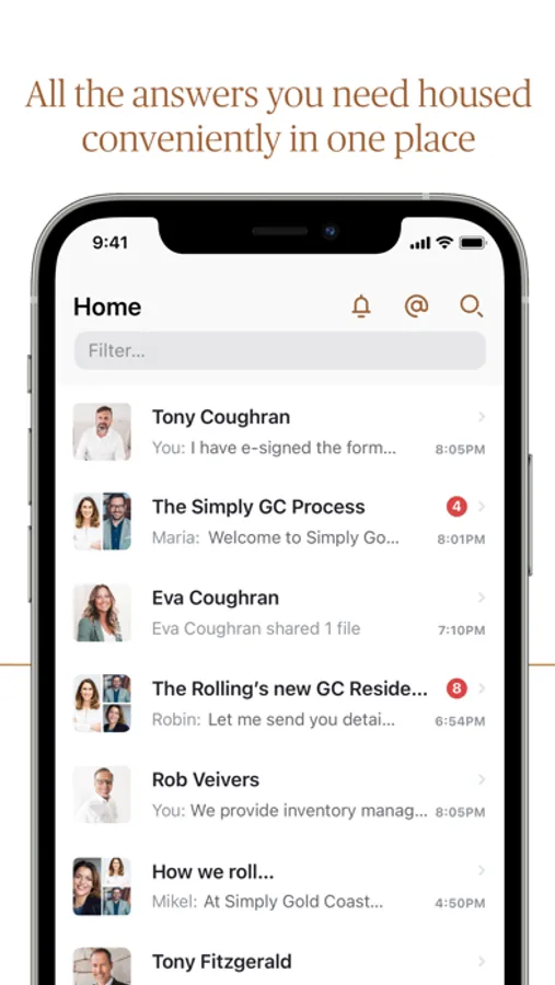 Our app, Simply GC, is a secure and sophisticated space that provides you with direct access to our team of property guns (if our process were any smoother, it’d have it’s own martini). Simply GC delivers 24/7 communication at your fingertips, with everything housed conveniently in one place. Our app includes secure messaging, video conferencing, virtual walkthroughs, document sharing, digital signature, and more.