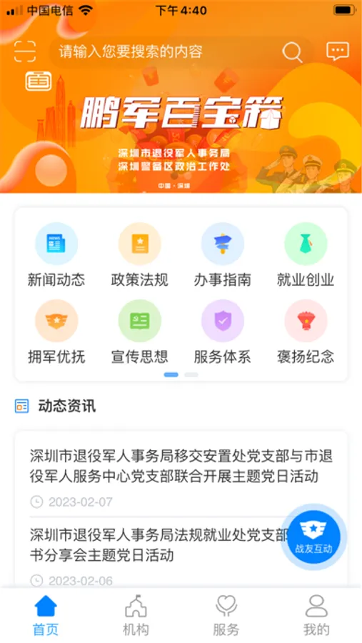 鹏城老兵app,退役老兵创业就业服务平台,汇聚最新资讯信息,发布最全政策法规,提供详细办事指南,功能齐全,为退役老兵带来更多贴心服务。鹏城老兵APP主要包括:新闻动态、政策法规、办事指南、就业创业等十二个功能模块。