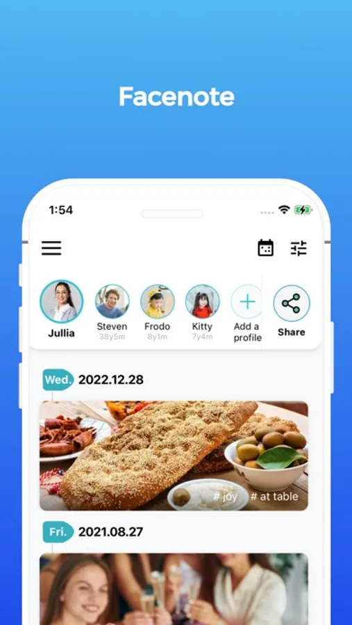 Use FACENOTE's powerful face detection artificial intelligence in order to organize all the precious moments saved on your phone into a timeline diary quickly and easily so that you can share them with your family/neighbors.