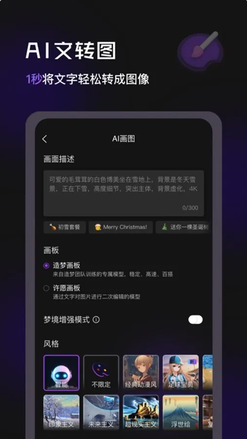 支持动漫风、剪纸、油画、水彩、CG渲染等20+绘画风格,另外还支持徐悲鸿、莫奈、丰子恺、毕加索等10+艺术家风格,为用户提供创作灵感,提升出图效率。