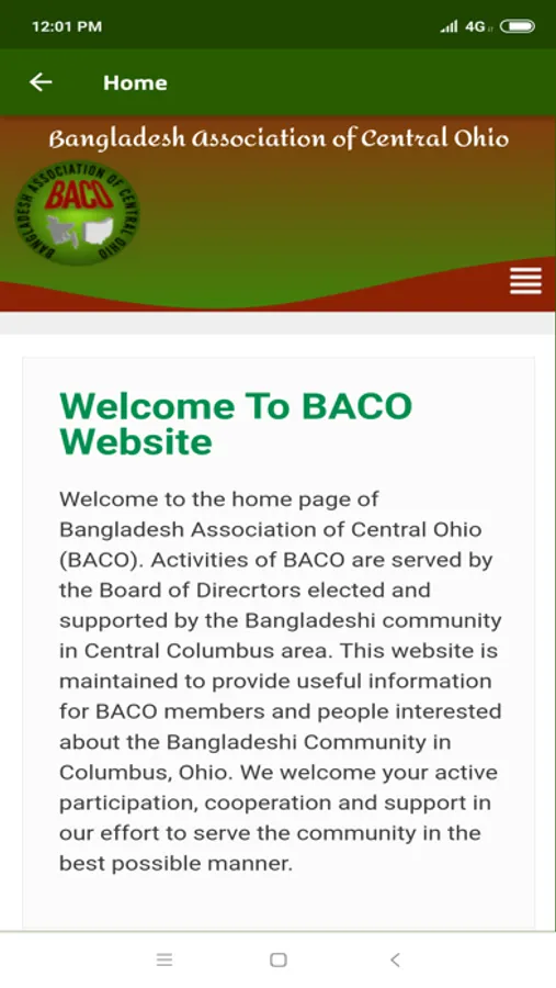 Bangladesh Association of Central Ohio (BACO). Activities of BACO are served by the Board of Direcrtors elected and supported by the Bangladeshi community in Central Columbus area. This website is maintained to provide useful information for BACO members and people interested about the Bangladeshi Community in Columbus, Ohio. We welcome your active participation, cooperation and support in our effort to serve the community in the best possible manner.