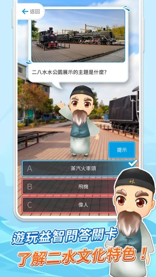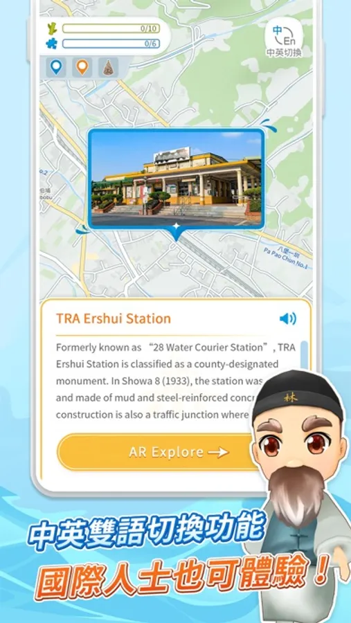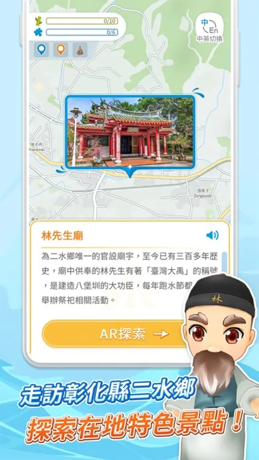 「二水國際跑水節 擴增實境AR雙語導覽APP」藉由擴增實境AR技術導入,連結在地文化景點、益智趣味解謎等,並結合中英雙語介面切換功能,讓更多國際人士了解二水與跑水節活動,提升觀光內涵與歷史傳承。